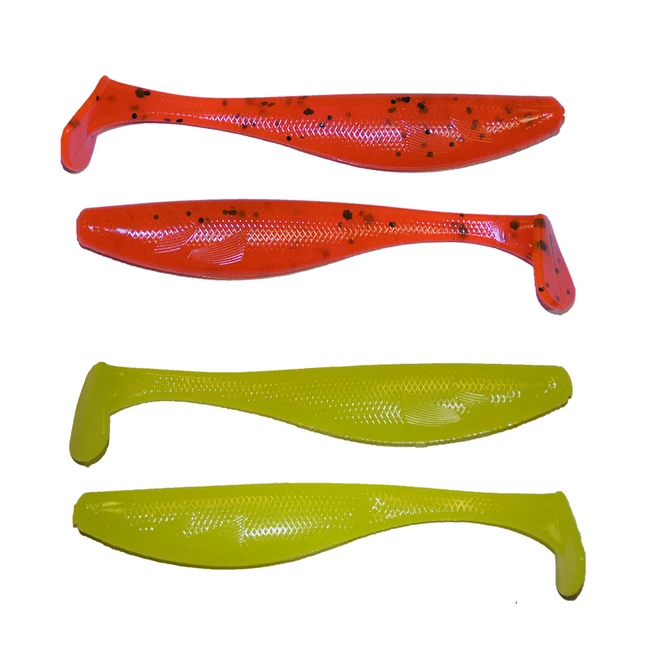 Great kick from the tail and rock from the body give this easy to rig and fish saltwater soft bait action that delivers. Available as a 4 pack with a range of tried and tested solid colors and twin color laminates. Ideal for light soft baiting targeting species like Snapper, Gurnad, Blue Cod, and Kahawai.Â