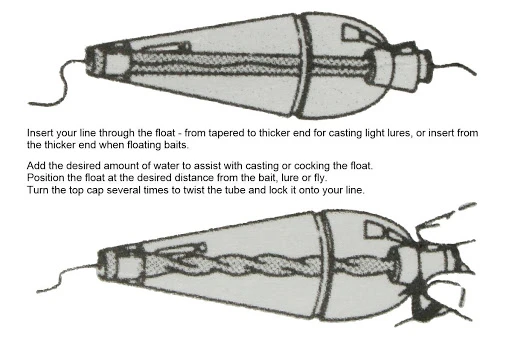 The A-Just-A-Bubble by Rainbow Plastics is an adjustable float that can be used as a stationary float or a slip float to fish at the desired depth. Rig with the wider end of the float toward the rod tip when suspending baits or rig with the narrower end of the float toward the rod tip when retrieving lures and flies. Simply feed your line through the float, slide it into position and turn the top cap to twist the internal surgical rubber, locking the float onto the line. This allows the float position to be adjusted in seconds, without the use of pegging or stoppers that can be time-consuming and damage the line. Simply open the top cap to add water to cock the float increase casting distance or cast light flies or lures with a spin rod.