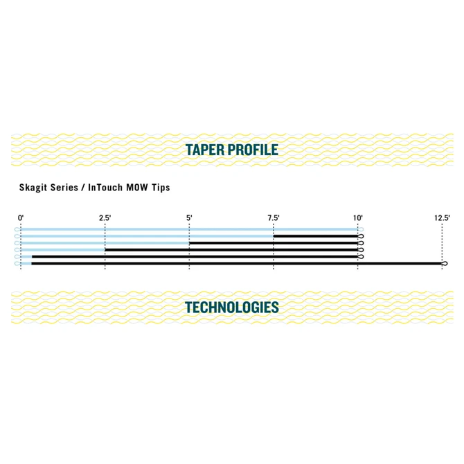 The Heavy MOW Tips feature T-14, with a sink rate of 9″ per second, for the sinking material. Each of these tips has either a light blue floating section, or if full sinking a dark blue colour, for easy identification. The Heavy MOW Tips are designed for the large flies and are ideal for Skagit lines of 575 grains and more. There are six unique tips that make up the series.